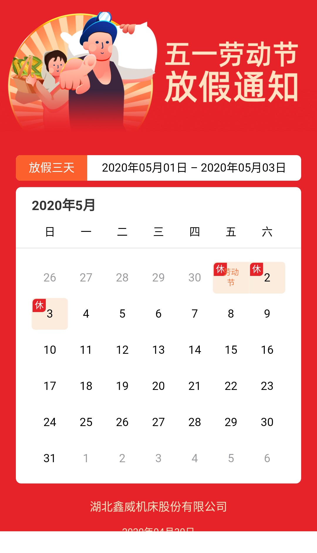 一、放假时间:2020年5月1日至2020年5月3日,共3天。5月4日正式上班。